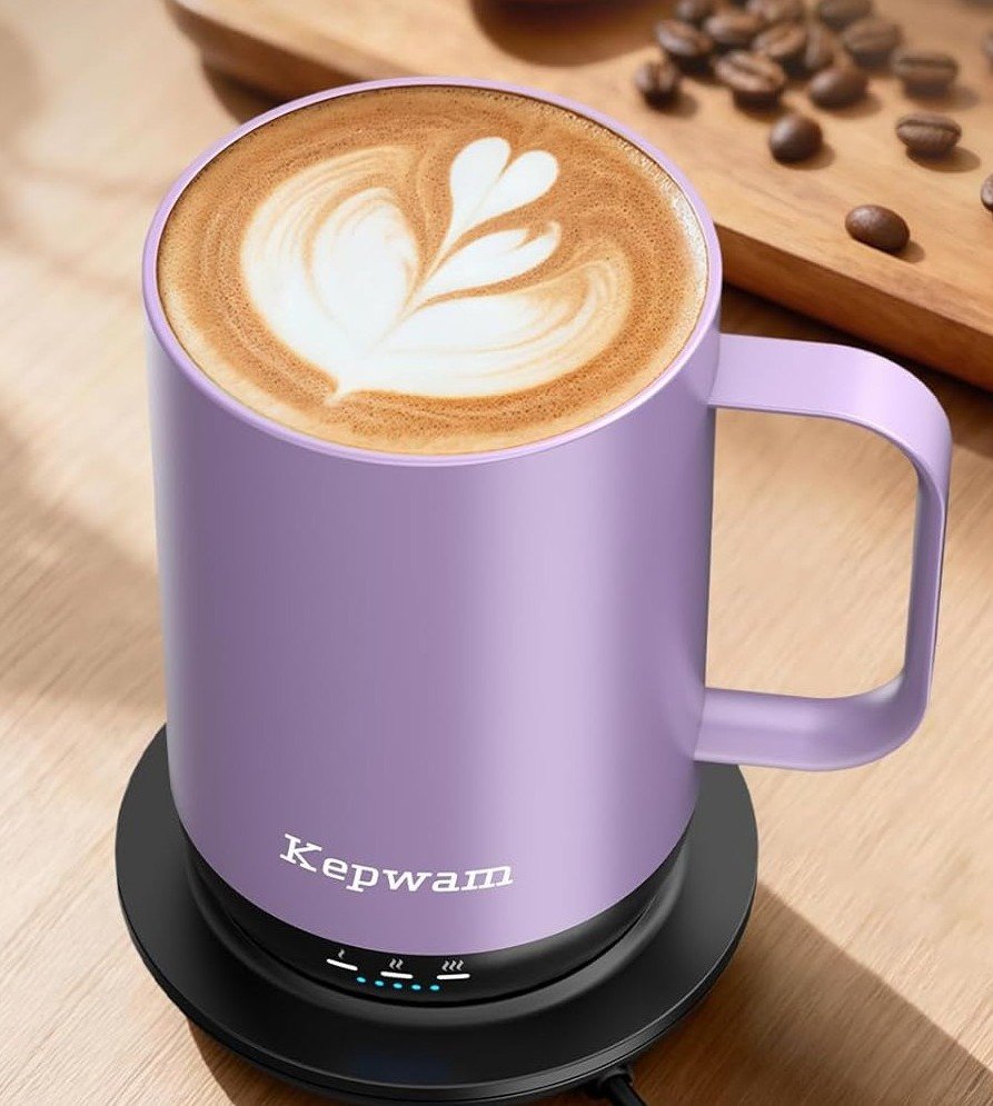 The Kepwam Mug offers customizable temperature settings at 113°F, 131°F, or 149°F, providing up to 4.7 hours of wireless warmth, with an included charging coaster for all-day use. Control is effortless via the Kepwam App for precise, real-time adjustments or by pressing the button for immediate heat. It features safety auto-off modes that activate when empty or after 3 hours of inactivity on the charging base, protecting the battery and preventing dry heating.