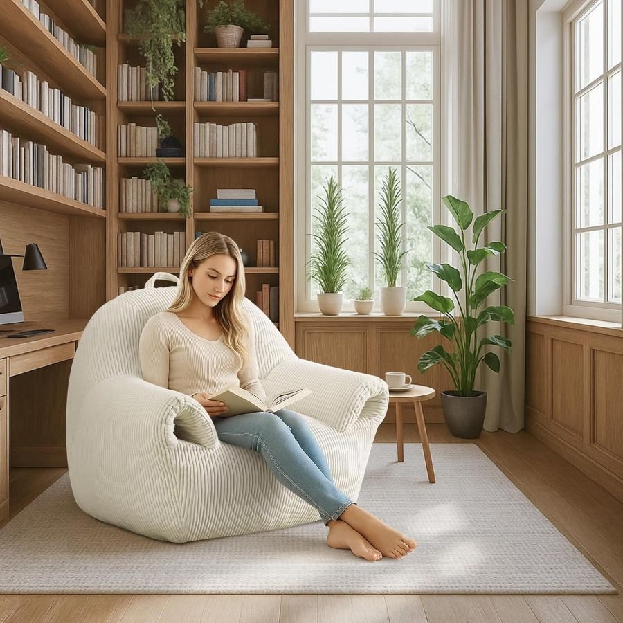 This bean bag chair features high-quality corduroy fabric that is soft, cozy, and durable, perfect for daily use. Its reinforced sewing ensures each seam is solid and reliable, enhancing longevity against wear and tear. The bottom is equipped with a non-slip back design, providing stability and preventing shifting on the floor for safe and comfortable lounging.